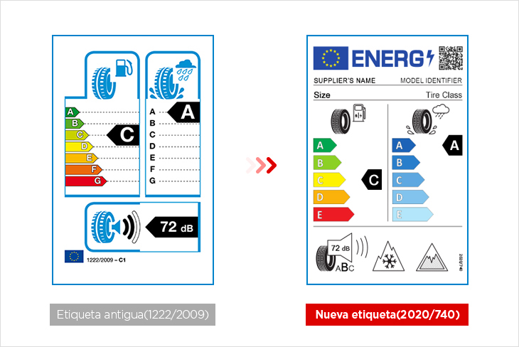 Con este fin, se reorganizaron la clasificación de resistencia a la rodadura (RR) y agarre en mojado y la clasificación de ruido se cambió de símbolo (s) de onda de sonido a caracteres A / B / C.